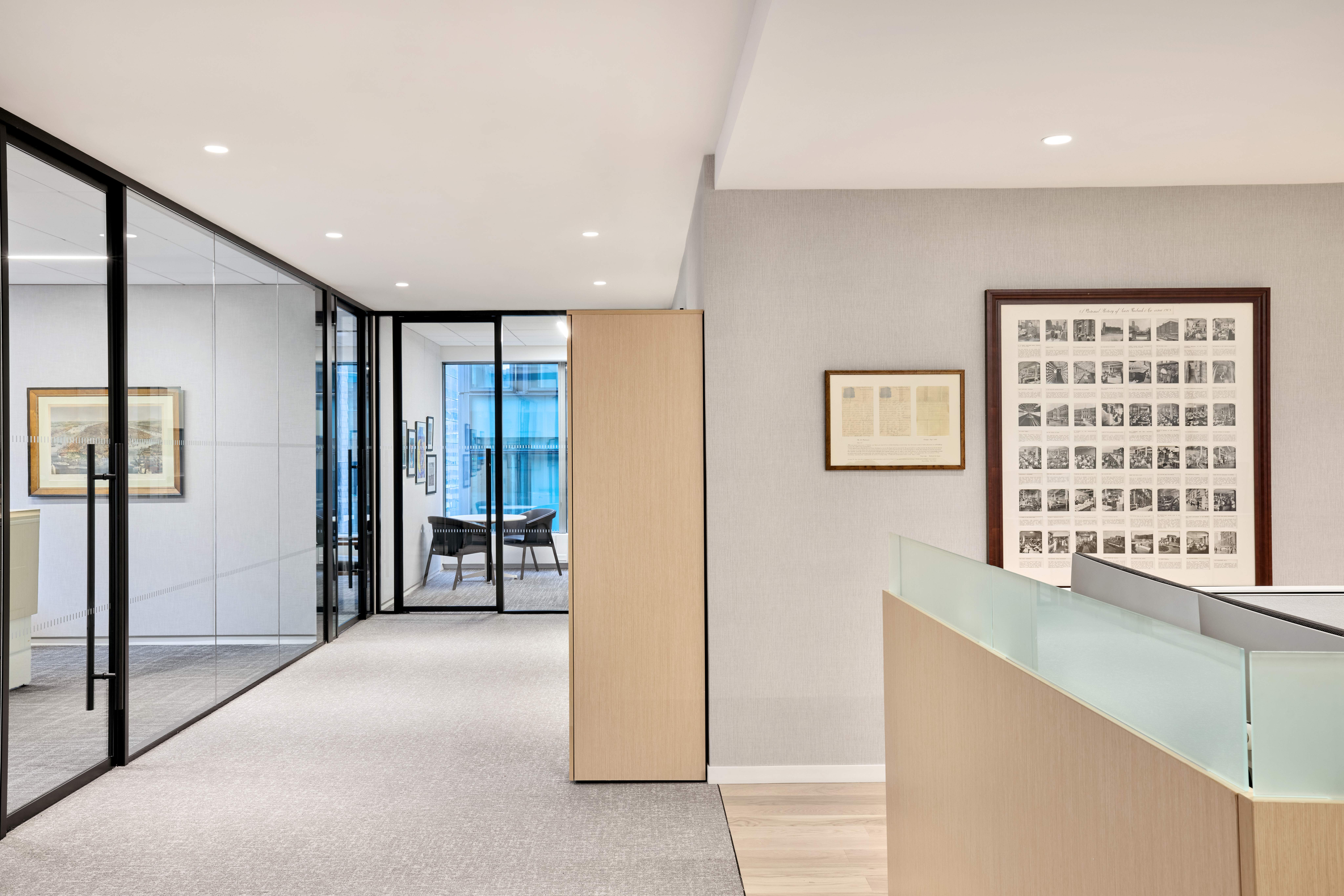 At the heart of the design is a concept of layered perspectives — an idea inspired by the firm’s legacy of passing down values and wealth across generations. This philosophy informed the selection and layering of materials, textures, and spatial sequences, shaping an experience that reflects continuity, depth, and quiet confidence. Clean detailing, light wood tones, and a soft, neutral palette come together to create a bright, open environment rooted in calm sophistication.